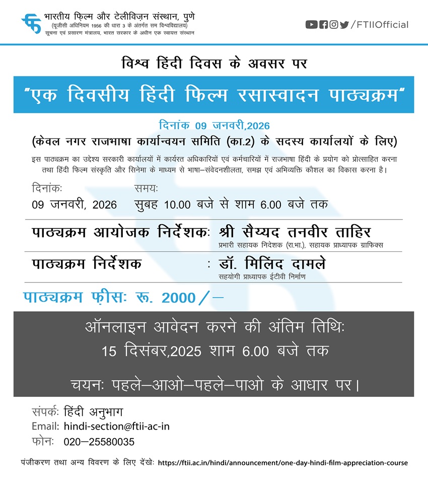भारतीय फ़िल्म और टेलीविज़न संस्थान (भाफ़िटेसं), पुणे, हिंदी अनुभाग के अंतर्गत “ एक दिवसीय हिंदी फिल्म रसास्वादन पाठ्यक्रम ” की घोषणा करता है ।